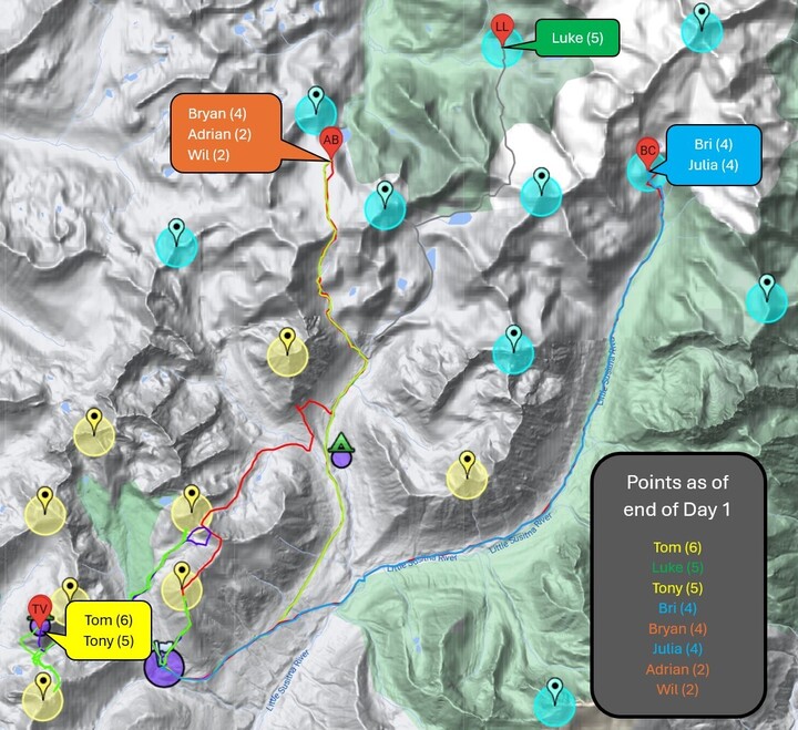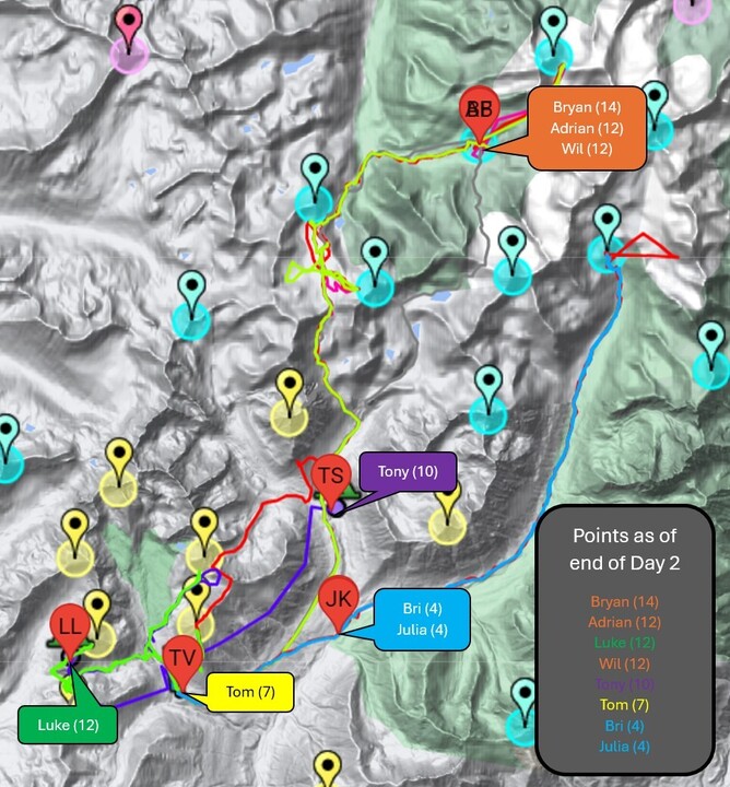 Wil and Adrian hightailed it up to the Snowbird hut but didn’t tag any waypoints along the way. They get +1 for camping and +1 for not being alone, ending the day with 2 points each.